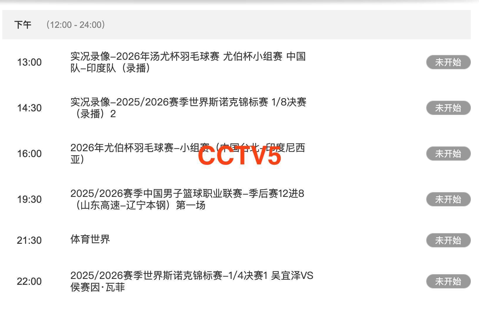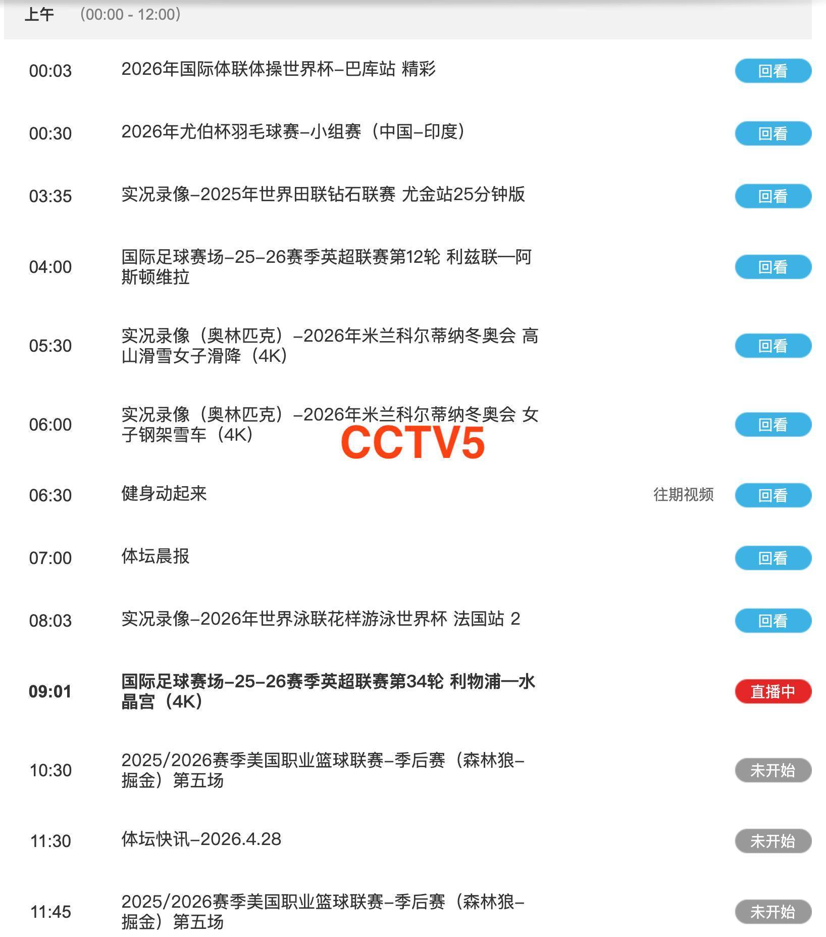 中央5套CCTV5、CCTV5+直播节目表