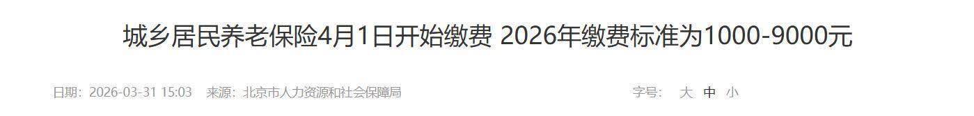 参考资料:北京市人力资源和社会保障局—城乡居民养老保险4月1日开始缴费 2026年缴费标准为1000-9000元
