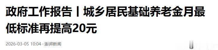 今年政府工作报告明确指出,自2026年1月1日起,全国城乡居民基础养老金最低标准将有所调整,每人每月增加20元,为广大居民生活保障添砖加瓦。也就是说,国家保的这个“底线”,从每月143元涨到了163元。