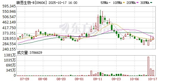 10月17日,映恩生物股价以334.2港元/股收盘,最新市值为294亿港元。